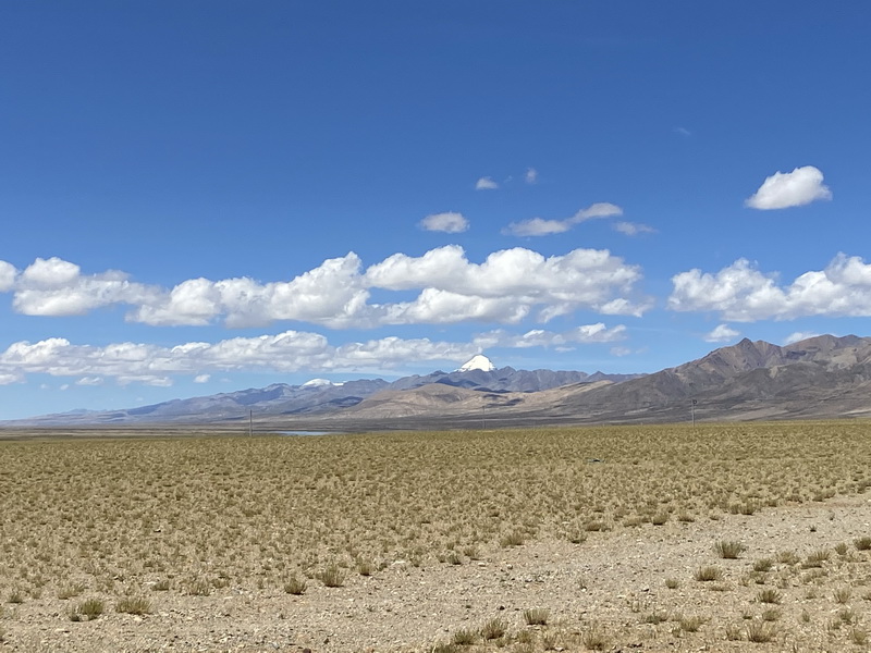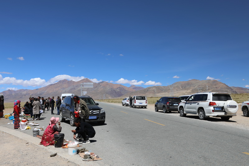 这里路边会有很大的玛旁雍错景区的售票处和管理处,但是不知是因为疫情还是别的原因这里是不开放的,公路边上有写着玛旁雍错景区的石碑上面系满了经幡,玛旁雍错湖畔距离公里还有比较远的距离只能看看,拍照都不好看。这里可以远远的看见神山——冈仁波齐峰,远远的就可以看出它的与众不同,在这里很多游客驻足拍照,当地藏民在这个路口摆摊销售一些特色的小商品,我们也在此驻足拍照。